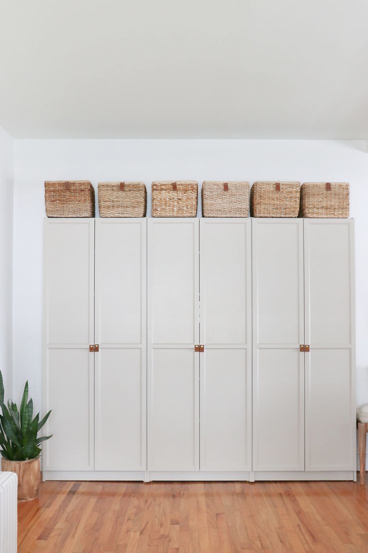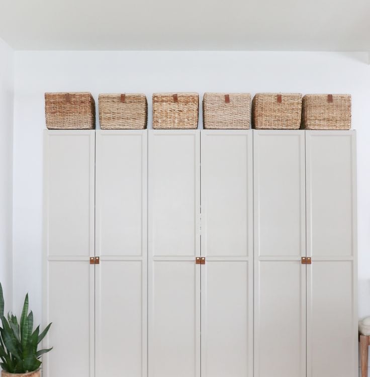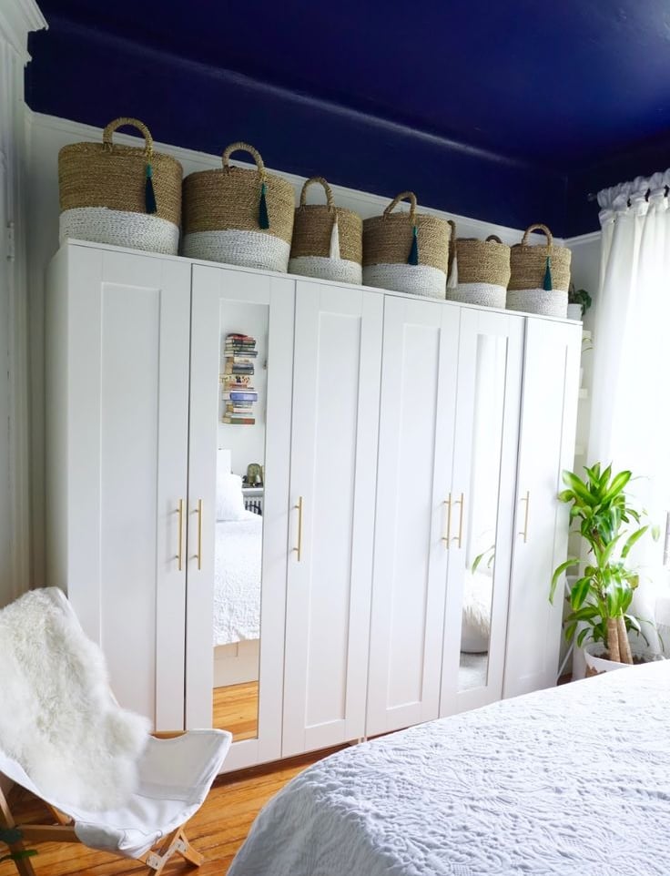 Use caixas organizadoras, cestos de vime ou até plantas para preencher o vão superior do armário e evitar acúmulo de poeira.